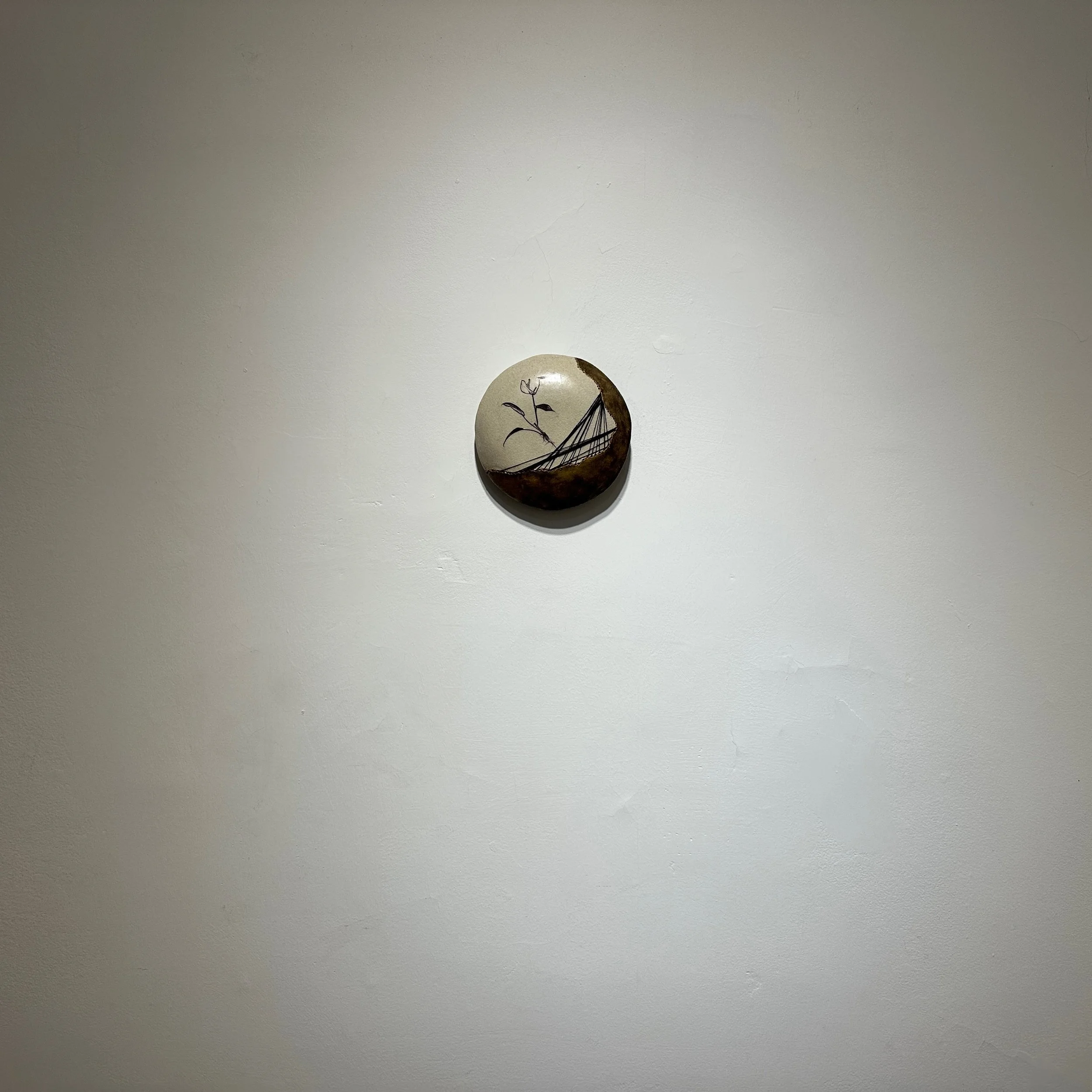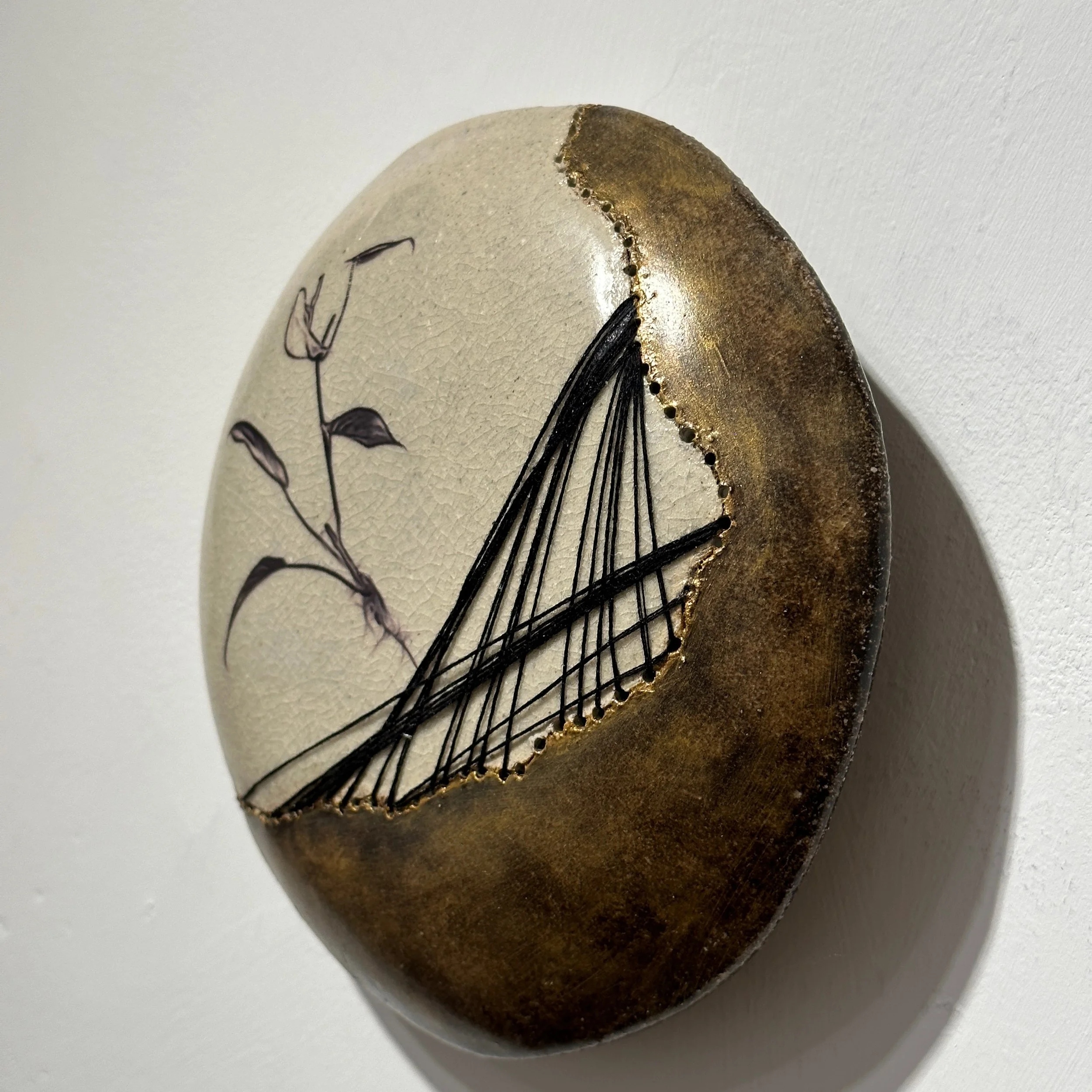 Her newest series of ceramic rooftops replicates the all too often viewed footage of submerged homes after flooding from hurricanes. A portion of the “Rising Water” project that will be shown at the Hyde Park Art Center in 2026 is exhibited outside in the Riverside Arts Center’s sculpture garden. Rows of these rooftops appear as a neighborhood of houses seemingly submerged into the pebbled ground. The installation reminds us of climate change disasters, while the art itself is subject to the elements of nature, as the shadows, the rain, and even the squirrels, add to the visual interplay.
