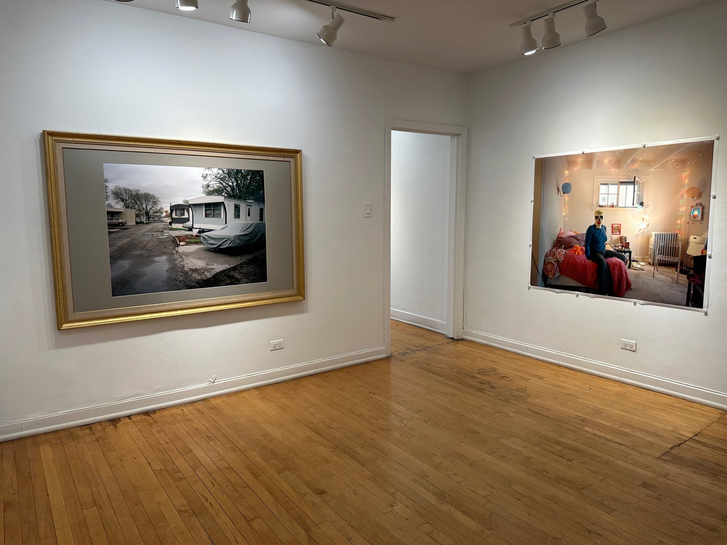 This exhibition features excerpts from many projects over the evolution of his practice for the past twenty years. Upon entering the galleries, you will first see photographs Ross made just before the 2008 housing bubble burst and recession. While living and teaching in Seattle, he watched aspiring developers quickly build homes seemingly inches apart from one another for maximum profit and fast turnover. Almost as soon as the houses went up, the economy took a downturn, and the homes sat vacant. In response, Ross began making his own architectural sites in miniature. Constructing model homes from cardboard, drywall, and wood, he deliberately misaligned walls, made floors and ceilings crooked, and covered tiny windows with plastic sheeting, evoking unlivable dwellings that are perpetually under construction.