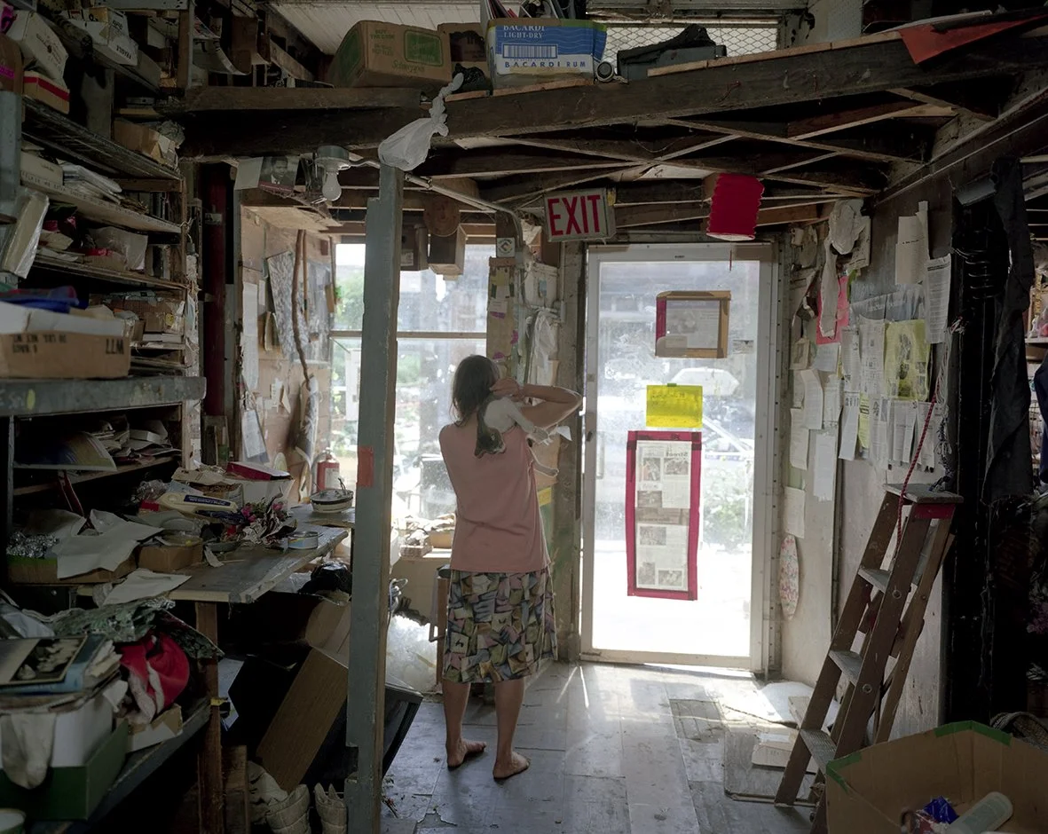 These models did not leave his studio and only existed as subjects for his photographs. Captured in close-up detail, the places appear life-sized. Ross calls this early chapter in his work Clear Blue, Sky. Made from 2006-2007, the photographs speak to how the capitalist housing dreams of this time were interrupted (much like the comma between blue and sky), never realistic in cost or design. Closet doors open into walls. Windows show a view only of the siding of the house next door.