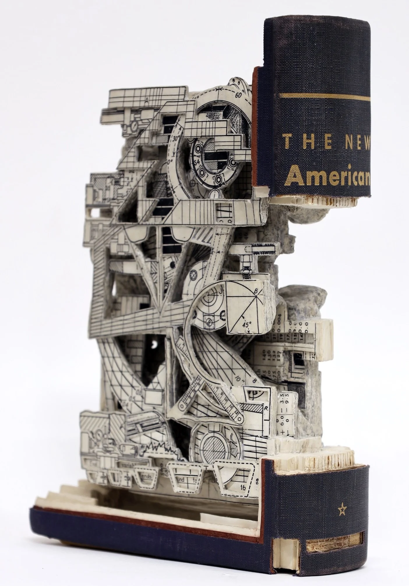 Dettmer’s method is profoundly meticulous. Through a series of carefully executed cuts, the artist carves into the pages of books, encyclopedias, atlases, and other printed works, revealing and transforming the printed content into sculptural objects. There is a randomness to what is revealed, followed by the thoughtfulness of what should remain. With each incision, Dettmer strips away layers to expose previously hidden texts and images, often editing the material and assembling it with his own vernacular that suggests new information.
