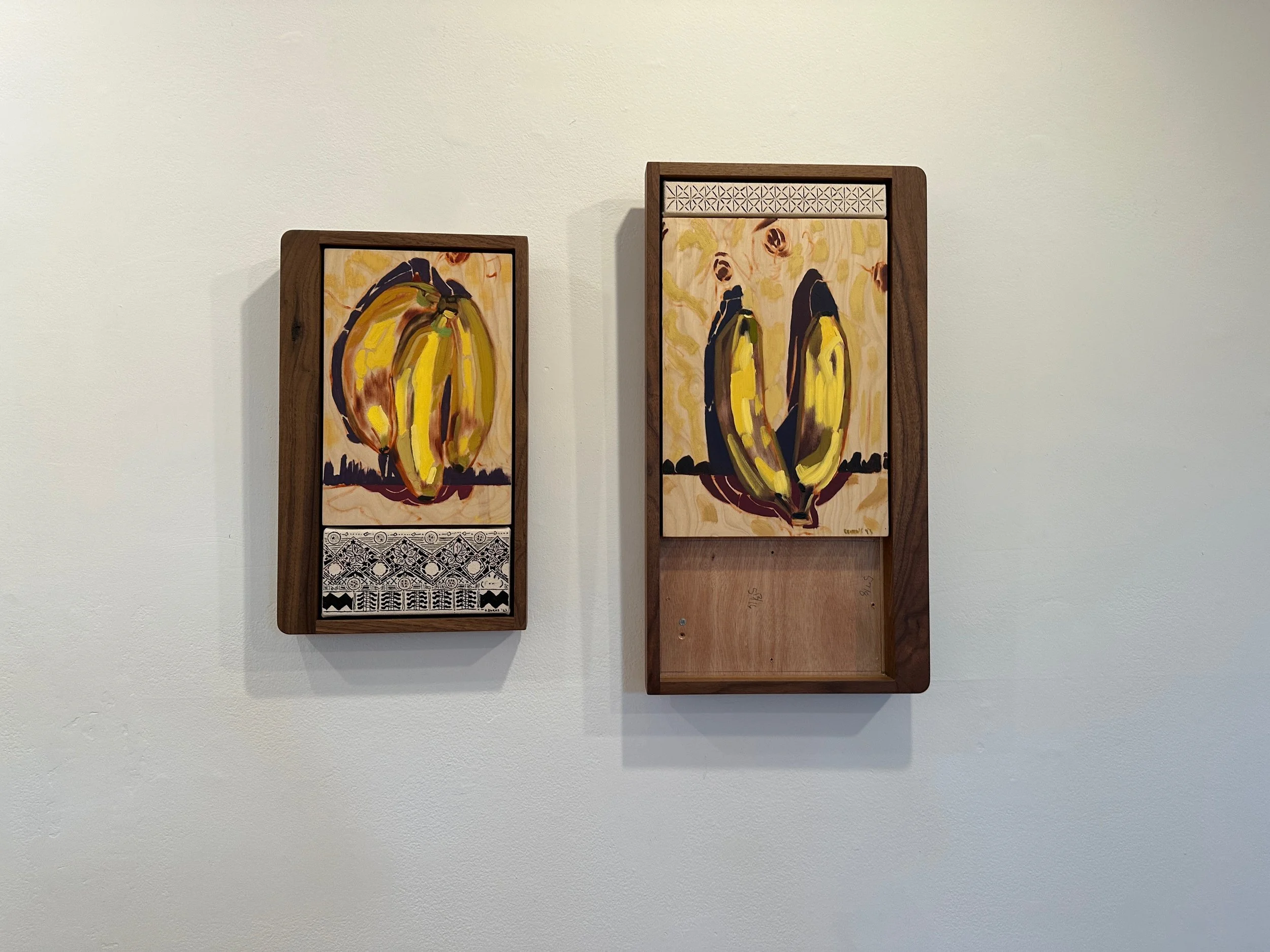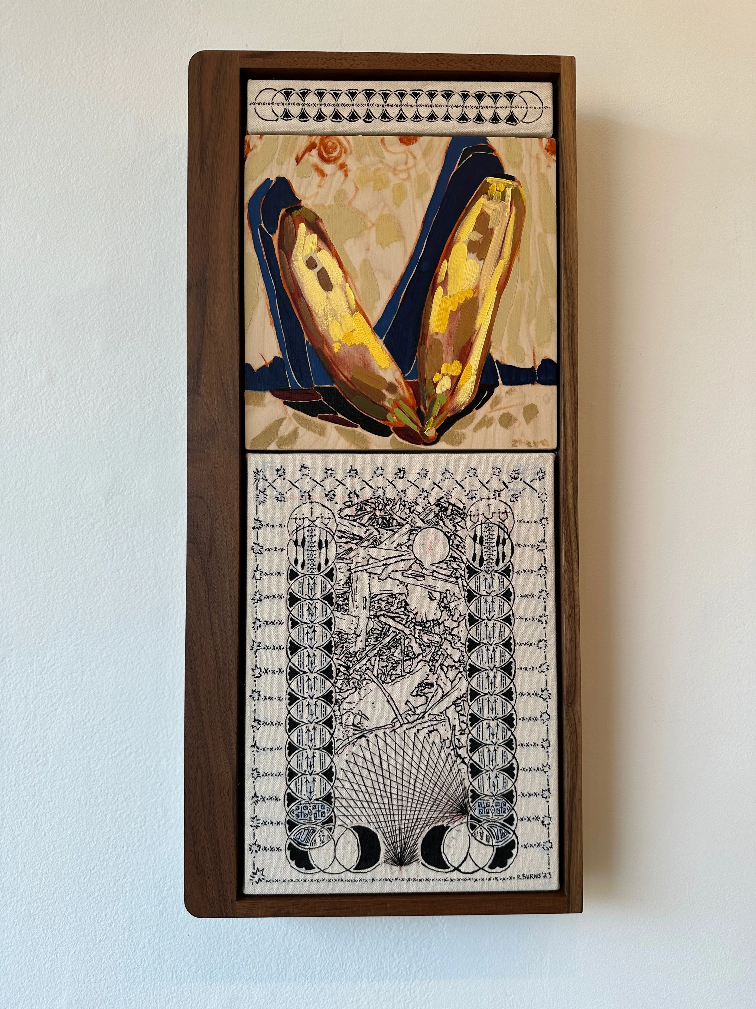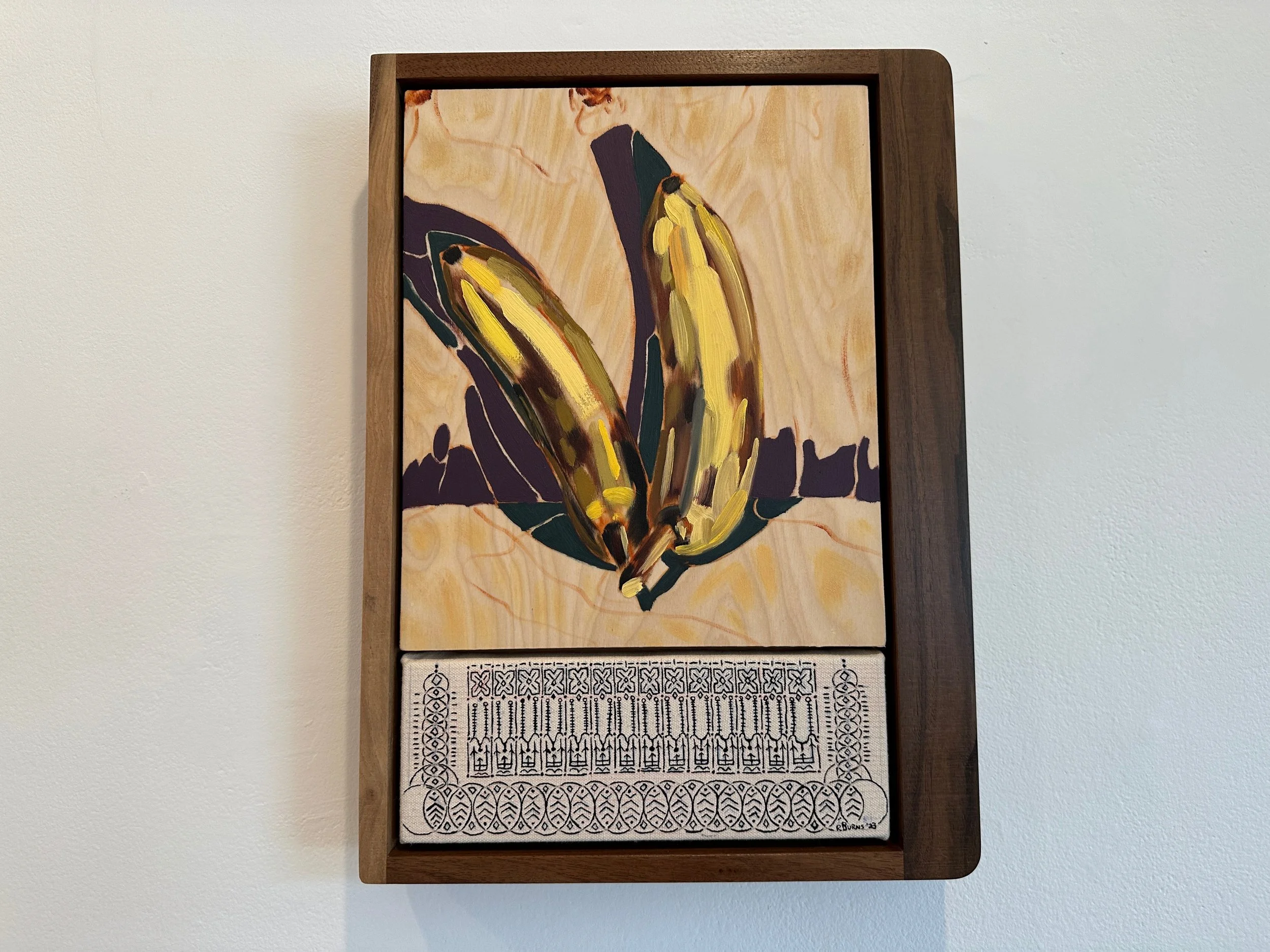 Alexandra Antoine’s series, I followed the drinking gourd…, combines printmaking, collage, and beadwork while incorporating stories of African Diaspora and tradition. Layered atop screenprint patterns of produce representing her culture and agrarian life, are personal photographic images and text of memories with an embellishment of sequins sewn into the surface, recognizing her Haitian roots. The colorful imagery of food contrasts with the black and white photos, while her writings further pull us into the reveal. Antoine’s art is a love story to her ancestry inviting us to share in her adventure.