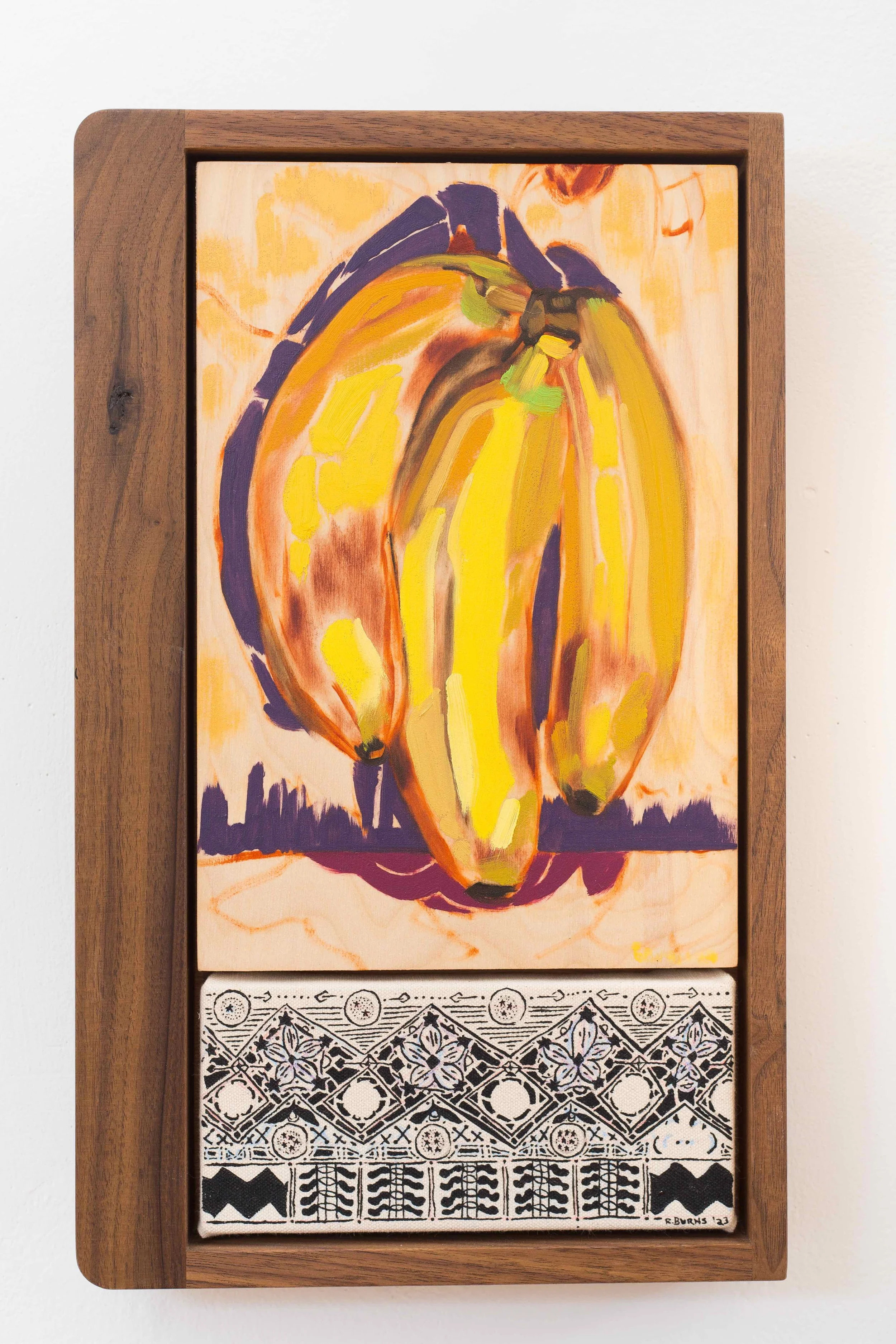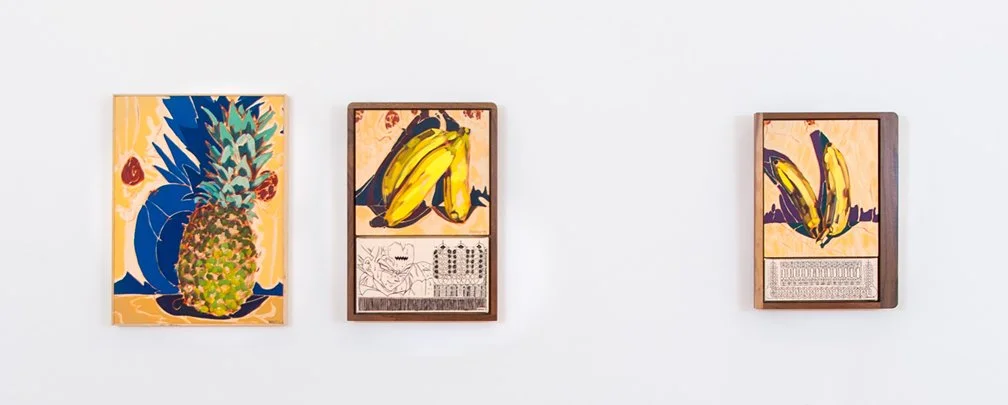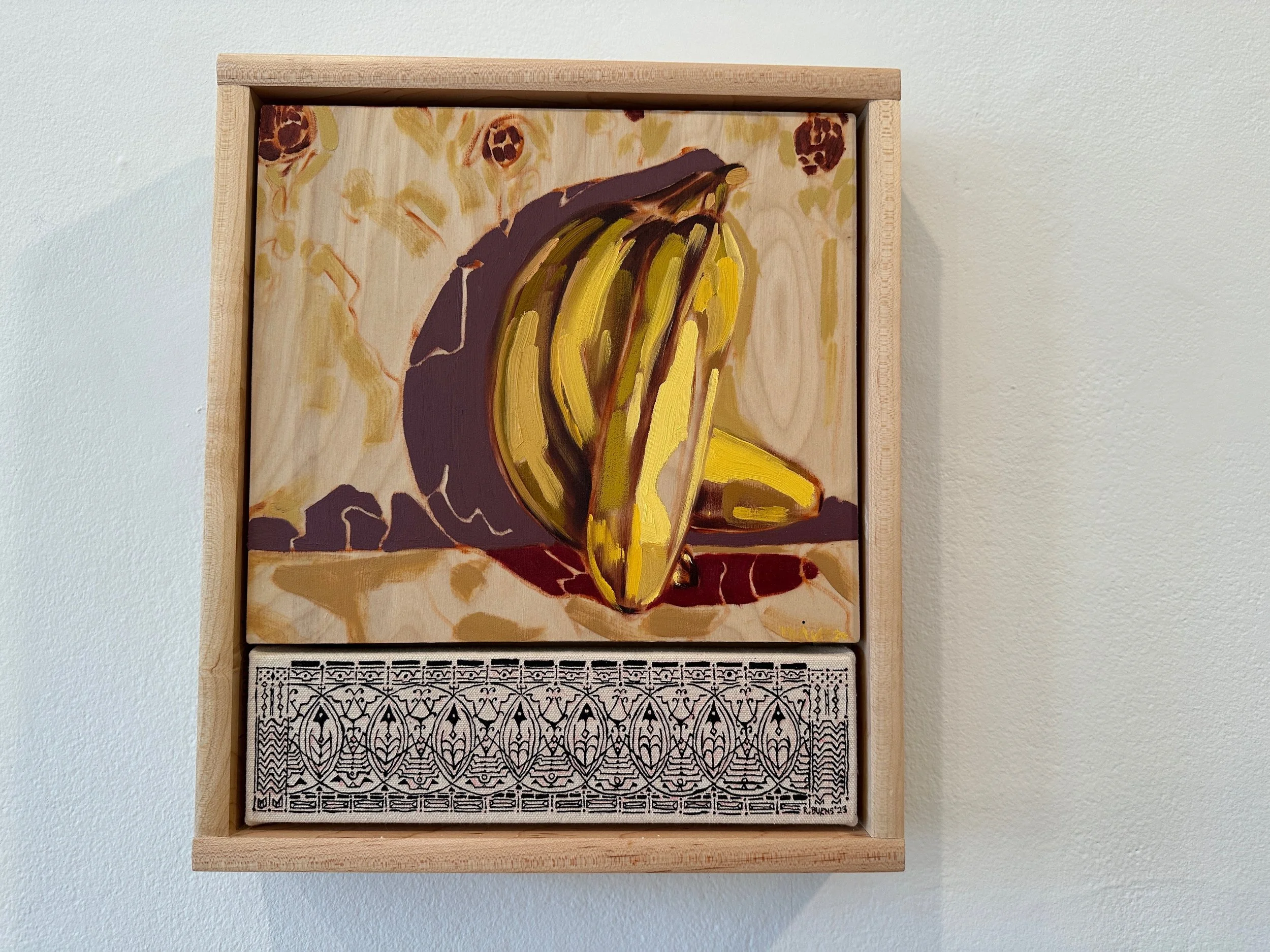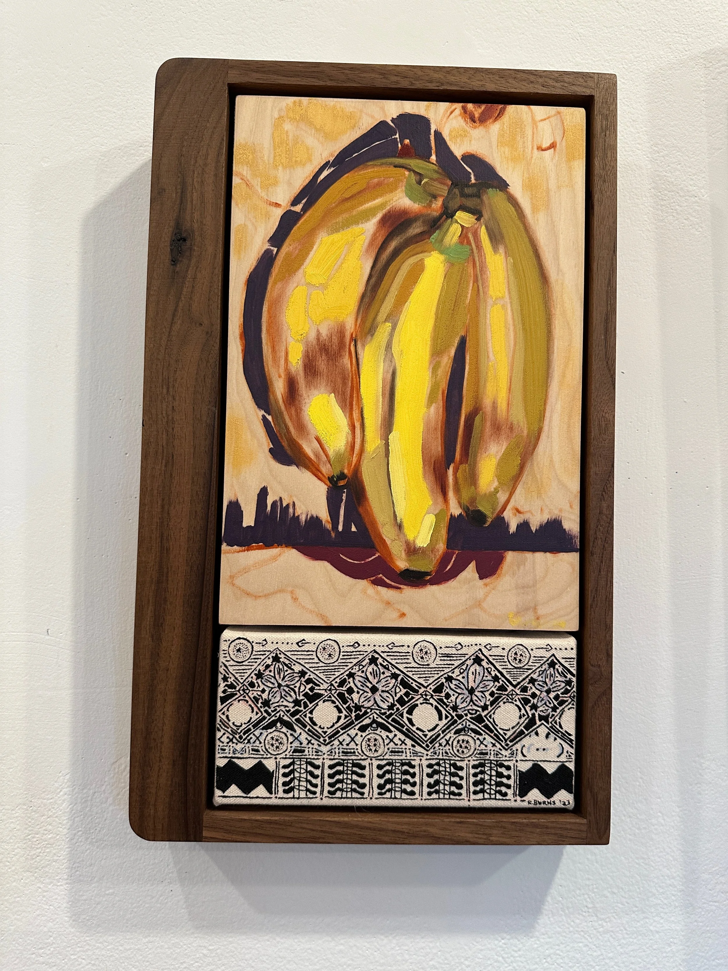 Alexandra Antoine’s series, I followed the drinking gourd…, combines printmaking, collage, and beadwork while incorporating stories of African Diaspora and tradition. Layered atop screenprint patterns of produce representing her culture and agrarian life, are personal photographic images and text of memories with an embellishment of sequins sewn into the surface, recognizing her Haitian roots. The colorful imagery of food contrasts with the black and white photos, while her writings further pull us into the reveal. Antoine’s art is a love story to her ancestry inviting us to share in her adventure.